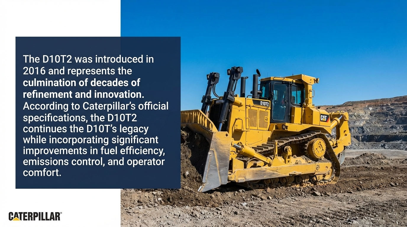 The D10T2 was introduced in 2016 and represents the culmination of decades of refinement and innovation. According to Caterpillar's official specifications, the D10T2 continues the D10T's legacy while incorporating significant improvements in fuel efficiency, emissions control, and operator comfort.